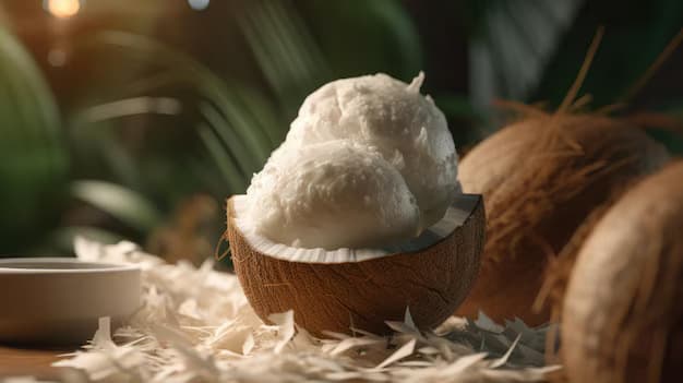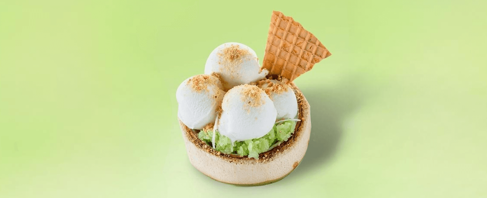 5Stk gebratene Riesengarnelen mit markfrischem Gemüse, Babymais in Currysoße, serviert jungen Kokosnuss