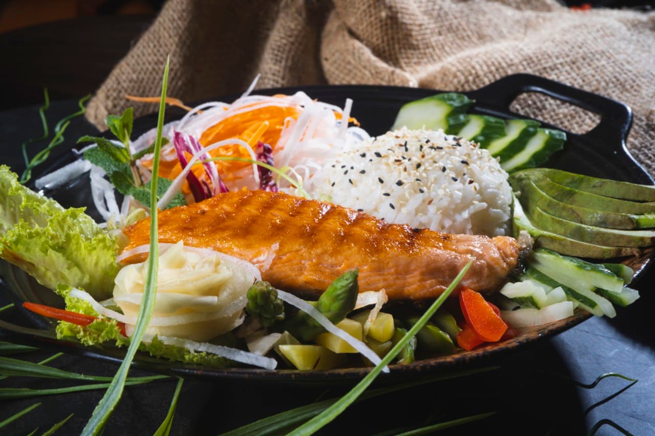 250g Gegrillter Lachsmit 3 Garnelen, serviert mit Teriyaki-Sofße und. Tamarind-Soße