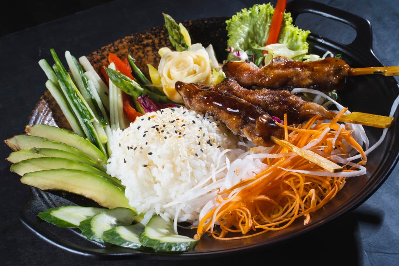 6Stk gegrillte Riesengarnelen ,Spargel, Zuckererbsenund ,SaisonalemGemüse, abgeschmeckt mit Reis in, serviert mit Teriyaki-Soße und Tamarind-Soße