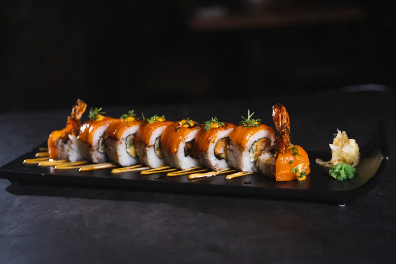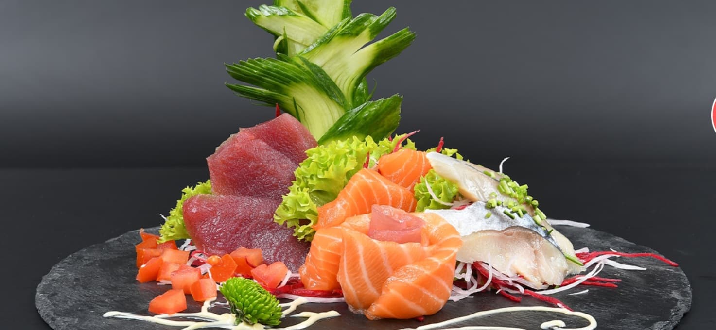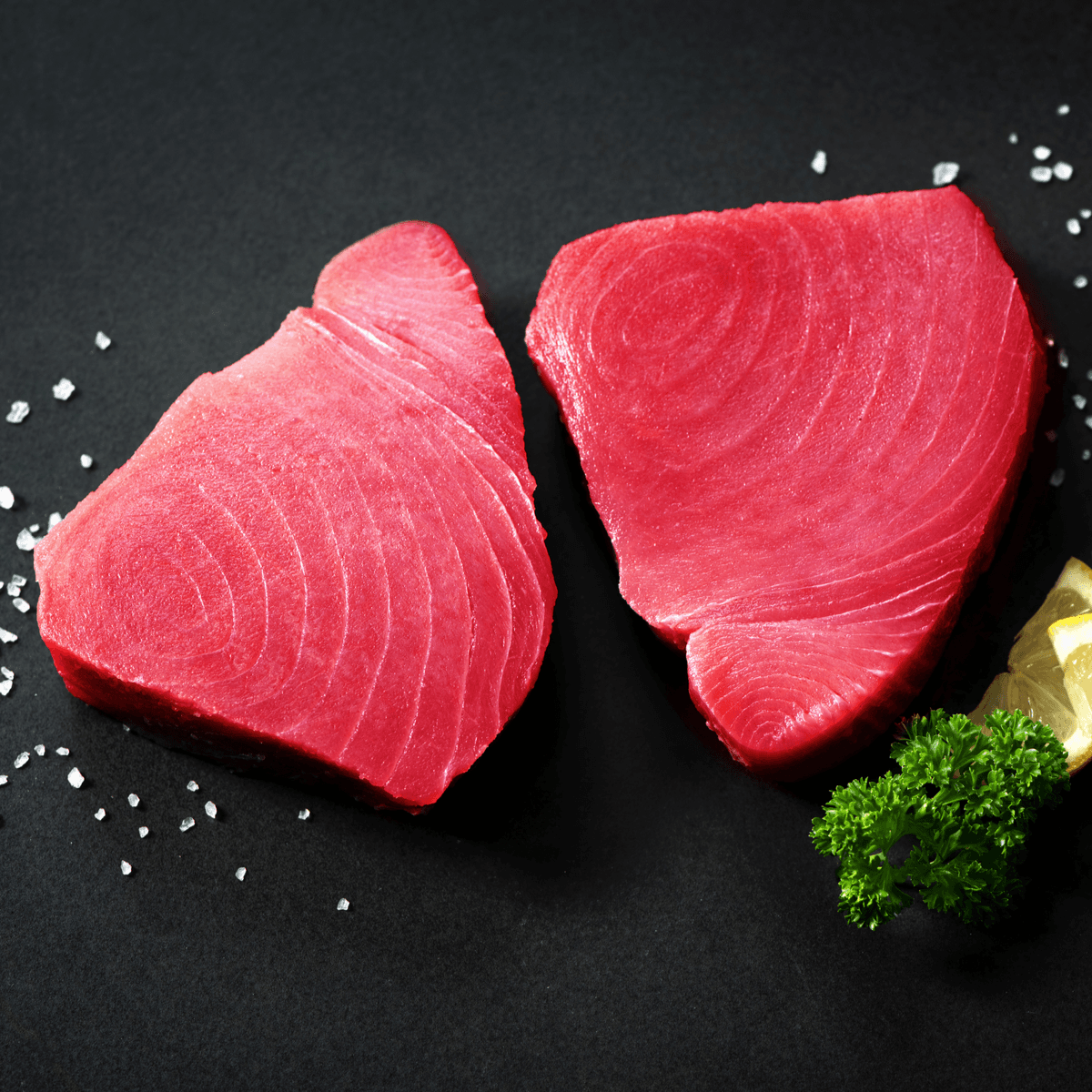 250g Gegrillter Thunfisch mit 3 Garnelen,serviert mit Teriyaki-Soße und Tamarind-Soße