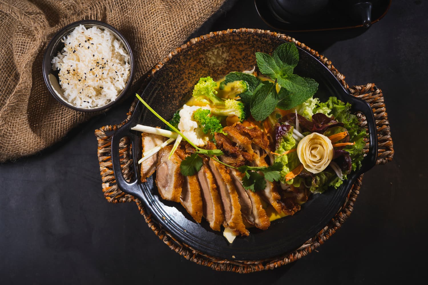 250g Gegrillte Hähnchenfilet aus Thailand, Spargel, Zuckererbsenund Saisonalem Gemüse, abgeschmeckt mit Reis in Deluxe Sauce