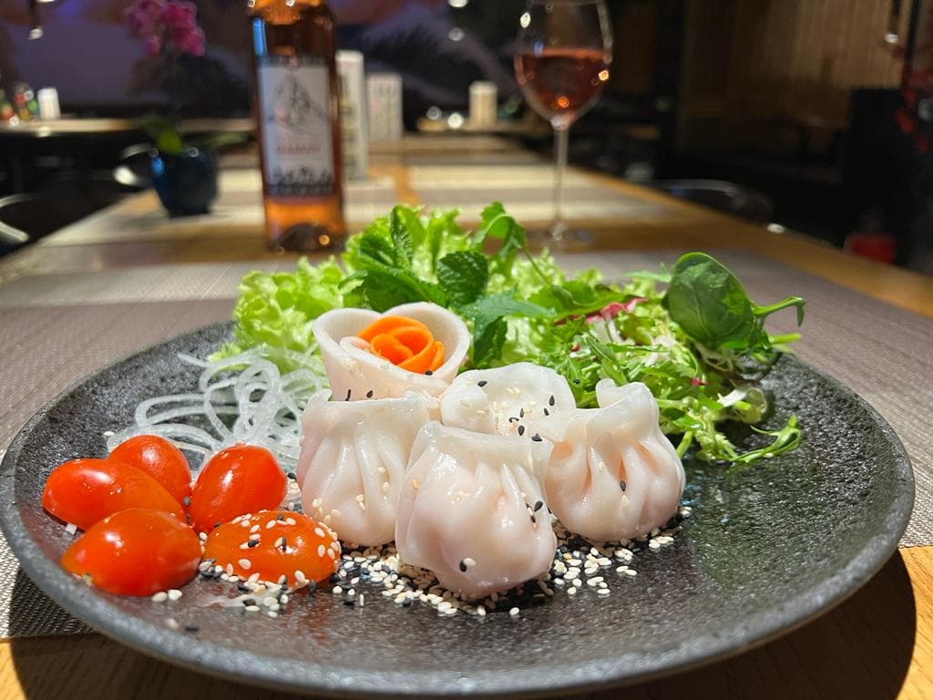 3stk Gegrillte Riesengarnelen, 3stk Jakobsmuscheln und Oktopus mit gegrilltem Gemüse, Kräuterseitlinge mit Tamarind-Soße